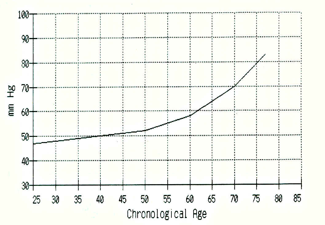 Use this chart to determine the biological age of your heart. You may want to print this chart out. Take your blood pressure and subtract the lower number (diastolic) for the higher number (systolic) . Take that number, and locate on the left (vertical) part of the chart. Go across from that line, and make a mark where it intersects the curve on the graph. Now draw a straight line down from that point to find your heart's biological age. This may be years younger or older than your actual age. Example: Let's say that your blood pressure is 140 over 80. 140-80 = 60. Find 60 0n the left part of the graph, then go across to the curve, then down to find your heart's biological age of 62.